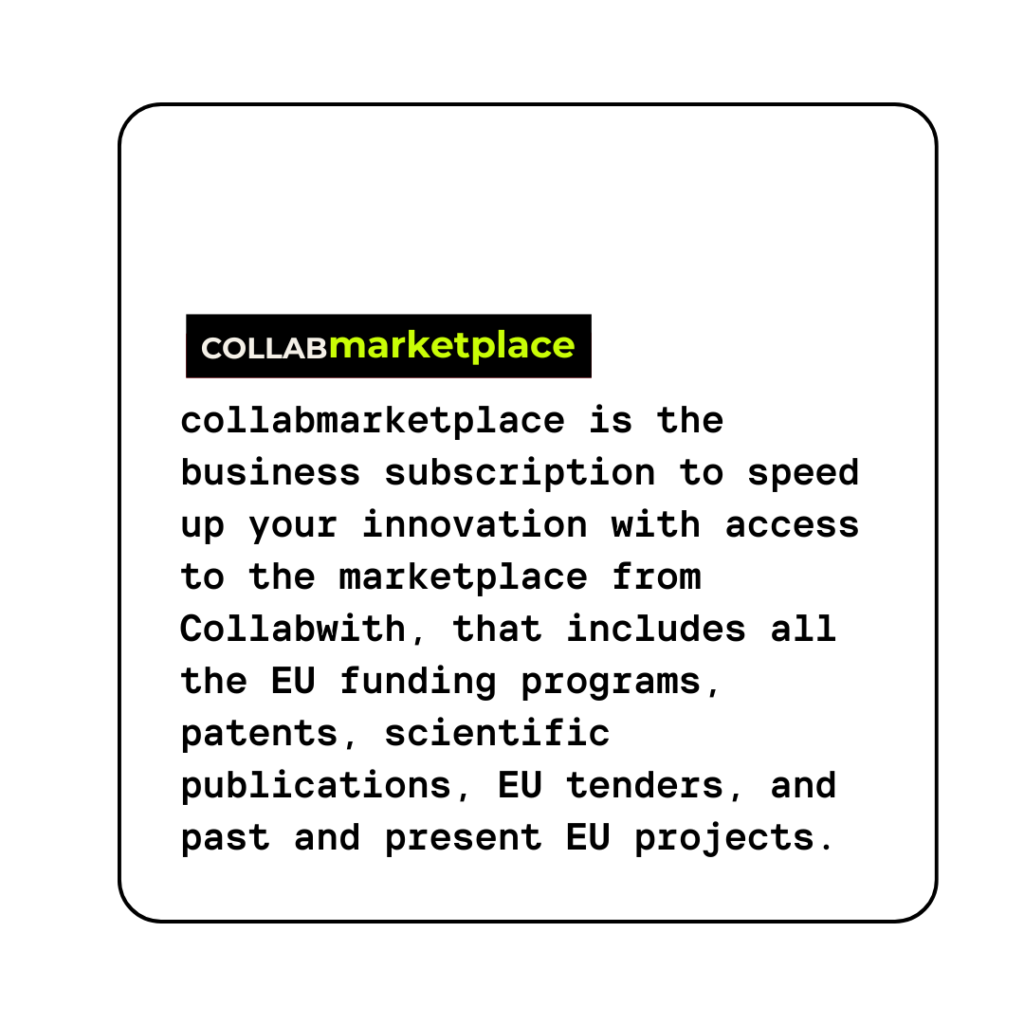 collabmarketplace is the business subscription to speed up your innovation with access to the marketplace from Collabwith, that includes all the EU funding programs, patents, scientific publications, EU tenders, and past and present EU projects.
