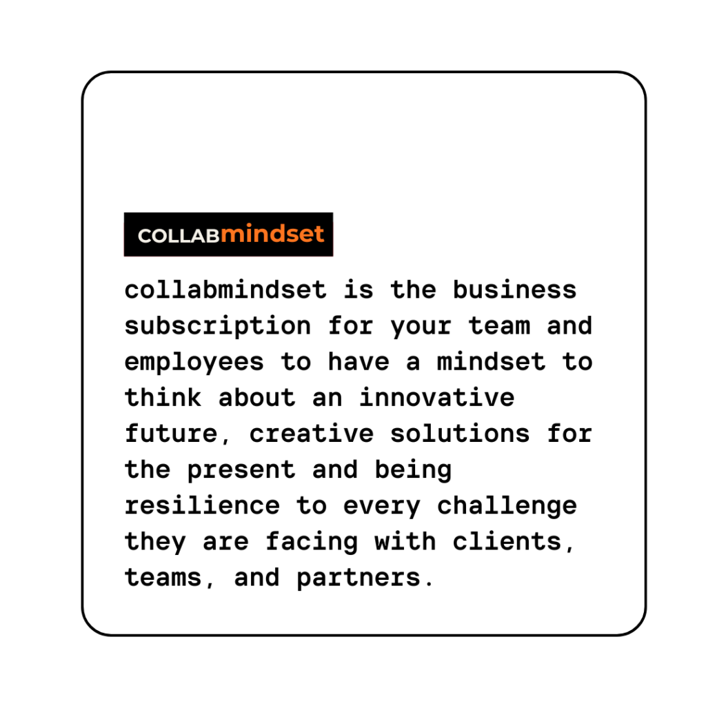collabmindset is the business subscription for your team and employees to have a mindset to think about an innovative future, creative solutions for the present and being resilience to every challenge they are facing with clients, teams, and partners.