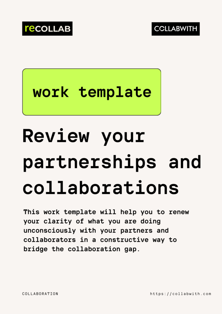 reCOLLAB, this work template will help you to renew your clarity of what you are doing unconsciously with your partners and collaborators in a constructive way to bridge the collaboration gap.