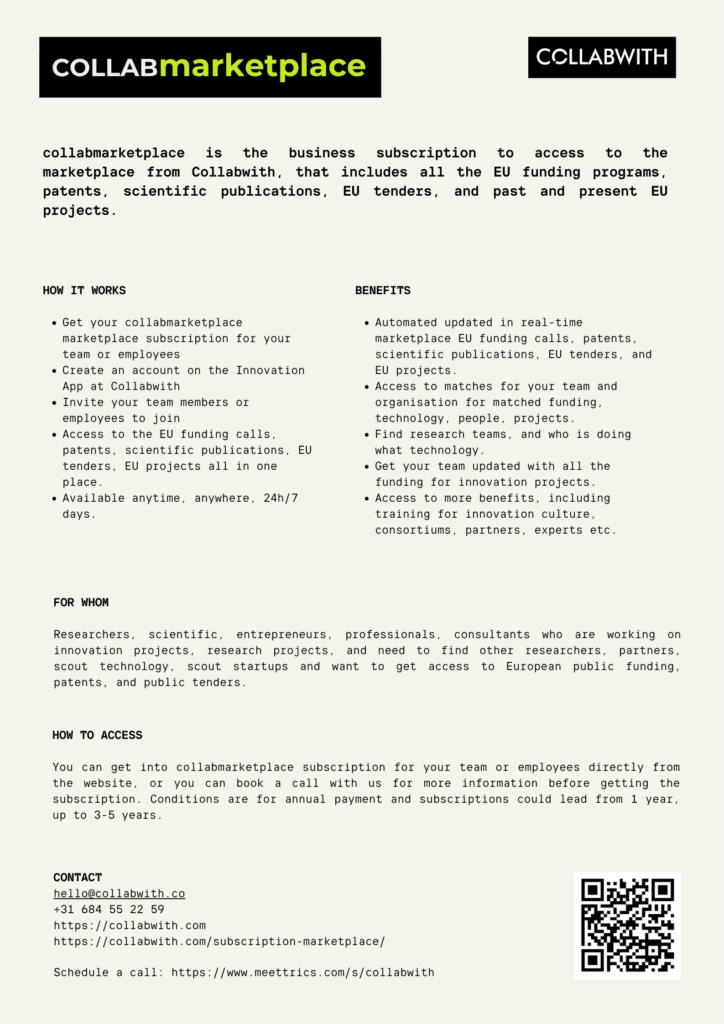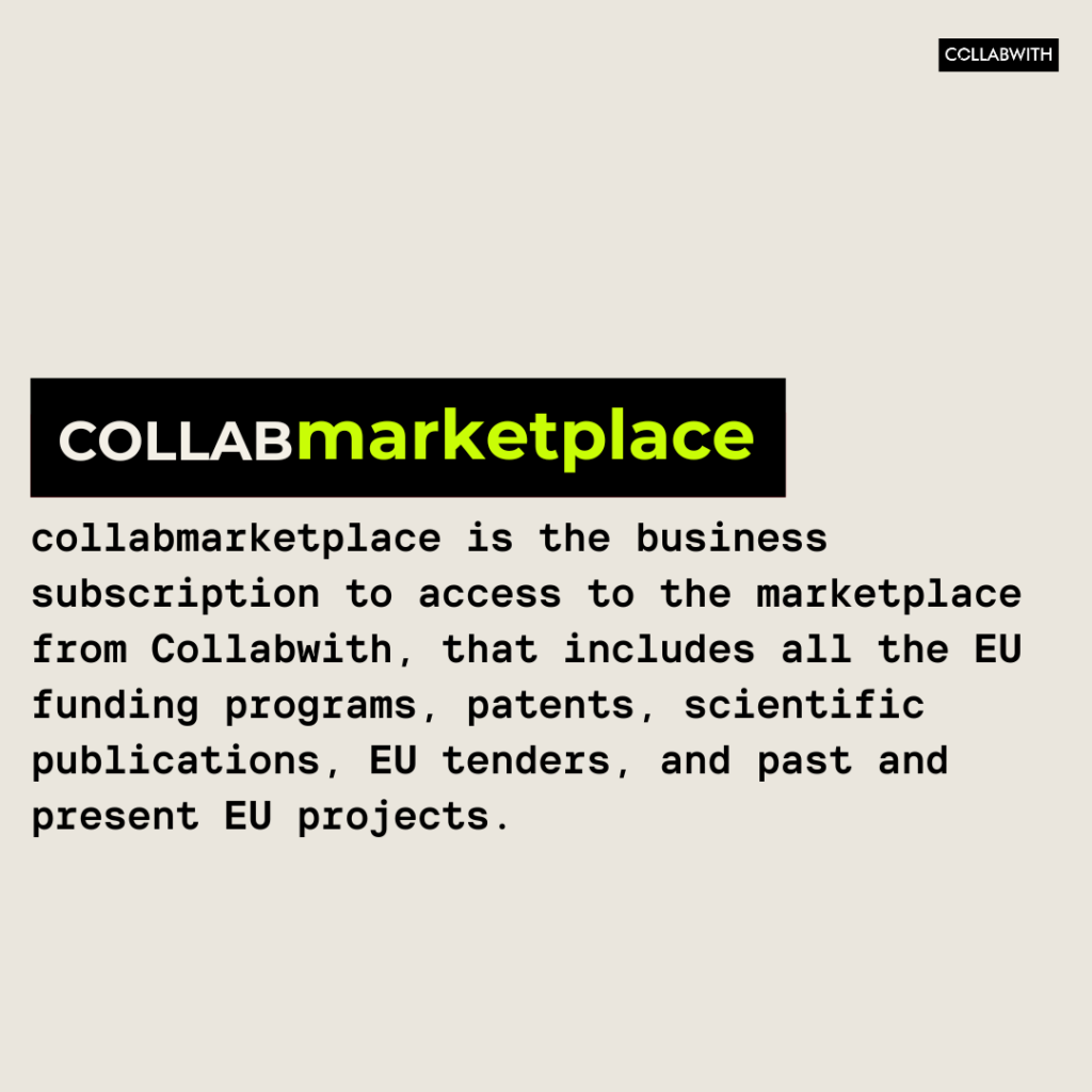collabmarketplace is the business subscription to access to the marketplace from Collabwith, that includes all the EU funding programs, patents, scientific publications, EU tenders, and past and present EU projects.